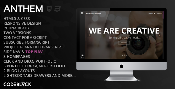 With multiple portfolio options with modern design features, click and drag portfolio, ajax portfolio, multiple home pages, about pages, grid blogs, 20+ files each in two versions, a top navigation and side navigation and more… No job is too big for Anthem. Built with the latest web technologies, display your website in style.